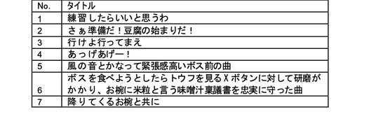 『スゴイツヨイトウフ Original Soundtrack』トラックリスト(一部)