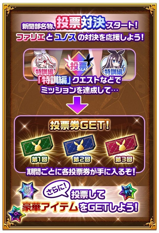 現在「投票対決! どっちのバニーでショウ!?」を開催しております。イベントクエストやミッションのクリアなどで獲得できる投票券を集めて投票すると、投票数や投票の結果に応じて「メモリアルルーン」などのアイテムを受け取ることができます。さらに、投票数に応じて「EXルーン」や育成に必要なアイテムを獲得できます。