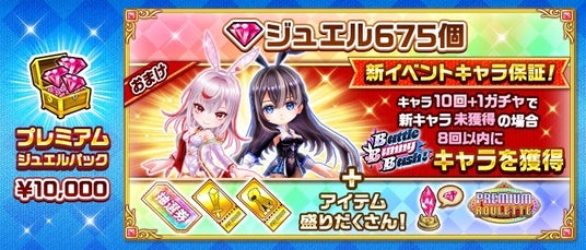 内容物:「ジュエル」675個、「プレミアムキャラガチャチケット ver.Battle Bunny Bash!」1枚、「プレミアム武器ガチャチケットver.Battle Bunny Bash!」1枚、「キャラ1体or武器2個抽選券」1枚、「プレミアムデイリールーレット」14日間、「ジュエルストーン2倍」14日間、「新イベントキャラ保証」