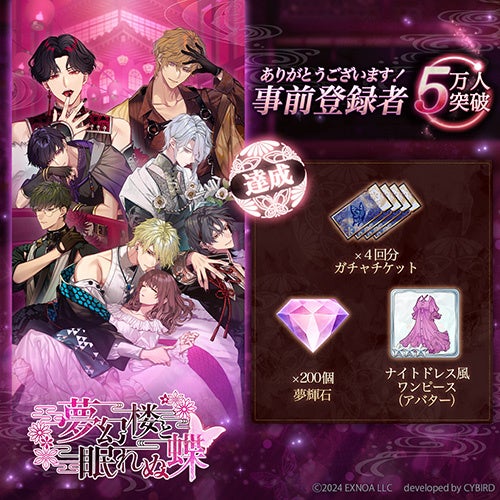 また、おかげさまで事前登録者数が5万人を突破しましたので、本作リリース時に「ガチャチケット4回分」「夢輝石200個」「ナイトドレス風ワンピース(アバター)」を全員にプレゼントいたします。