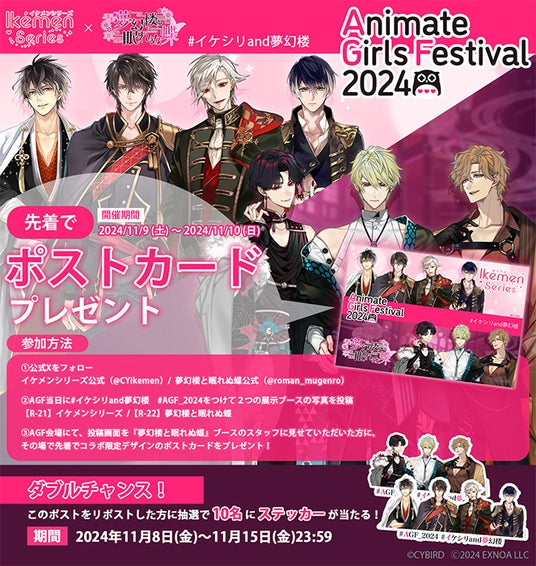 AGF2024「夢幻楼と眠れぬ蝶」ブースにて、株式会社サイバードが運営する人気恋愛ゲーム「イケメンシリーズ」とのコラボキャンペーン「#イケシリand夢幻楼 AGF2024フォトポスト企画」を開催いたします。当日会場にてキャンペーンに参加いただくと、コラボ限定デザインのポストカードをプレゼントいたします。またダブルチャンスとして、対象ポストをリポストした方に抽選で10名にステッカーをプレゼントいたしますので、当日は是非ご参加ください。