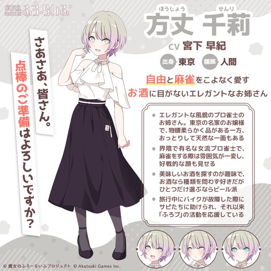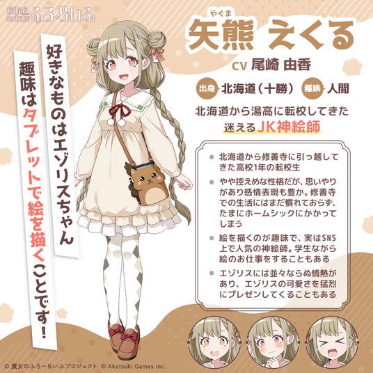 株式会社アカツキゲームス(本社:東京都品川区、代表取締役:戸塚 佑貴、株式会社アカツキ100%子会社)は、魔女×温泉×スローライフをテーマにしたIP創出プロジェクト『魔女のふろーらいふ』にて、新キャラクター「サウルナ(CV:上坂 すみれ)」、「ムト(CV:大森 日雅)」、「矢熊 えくる(CV:尾崎 由香)」、「方丈 千莉(CV:宮下 早紀)」の4名を発表したことをお知らせいたします。