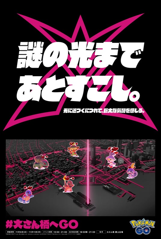 株式会社ポケモン(東京都港区、代表取締役社長:石原恒和)が、Niantic, Inc.(本社:米国カリフォルニア州、CEO:ジョン・ハンケ)と共同で提供するスマートフォン向け位置情報ゲームアプリ『ポケモン GO』では、11月11日(月)から毎週月曜日の夕方1時間にゲーム内で様々な「ダイマックスポケモン」が登場する「マックスマンデー」のイベントをスタートします。それを記念し、2024年11月6日(水)~11月11日(月)までの6日間、横浜・大さん橋にて「ダイマックス」をモチーフにしたリアル体験型イベント「#大さん橋へGO」を開催いたします。会場では、ゲーム内の「パワースポット」で大迫力の「マックスバトル」が楽しめるだけでなく、まるで「ダイマックスポケモン」が実際に登場したかのような雰囲気で撮影を楽しむことができる巨大なフォトスポットも設置いたします。会場にご来場いただいた方には、記念として「#大さん橋へGOキービジュアルステッカー」も配布いたします。