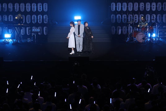 続いてステージに現れたのは、小山剛志さん、柚木涼香さん、Suaraさん。小山剛志さんの「横浜BUNTAIのみなさ~ん、うたわれるものですよ~ 」という声と共に、「真・うたわれるもののテーマ」の時間が始まりました。観客からの合いの手もバッチリで大盛り上がりのなか、歌詞にも登場している浪川大輔さんがサプライズ登場し、30周年の節目でついに同曲を小山剛志さんと一緒に歌い上げることとなりました。