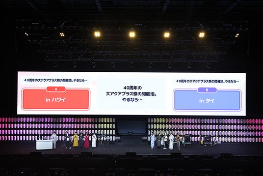 休憩を挟んだあとは、「アクアプラス2択祭」という企画を実施。画面にアクアプラスにまつわる2択が表示され、キャスト陣たちは自分がこちらだと思う側に移動。それぞれの陣営同士で討論を繰り広げました。様々なテーマがあるなか、「40周年の大アクアプラス祭の開催地は?」というお題では、どちらも行きたいという第3の回答が誕生。全員がその意見に賛同するという、大アクアプラス祭らしいハチャメチャな内容になっていました。もっともご来場の方たちを説得出来た(影響力のあるプレゼンをした)人「モーストバリアブル2択」には、柚木涼香さんが選ばれました。