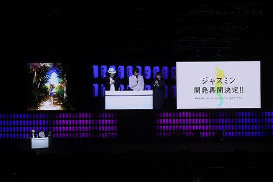 「大アクアプラス祭」の注目コーナーのひとつが新作発表です。今回は「うたわれるもの」シリーズ最新作『うたわれるもの 白への道標』(2025年秋発売予定)と、2015年に制作中止となった『ジャスミン』の開発再開が発表されると、観覧席から大きな歓声が会場に響いていました。