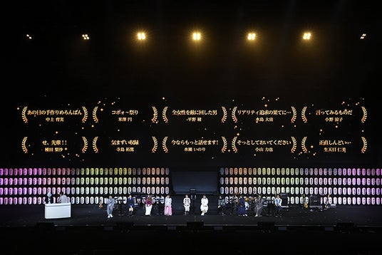 続くトークパートでは、「第1回日本アクアデミー賞」というアクアプラスの"オリジナル"の賞レースを開催。10名のキャスト陣がアクアプラス作品にまつわるエピソードを披露し、30周年に最もふさわしい話を語った方が「大賞」として表彰されます。生焼けかもしれないメロンパンを配ったという中上育実さん、実は『WHITE ALBUM2』の収録時とても辛い恋愛をしていたという生天目仁美さん、すべて嘘のエピソードで脚本賞を一方的に狙った水島大宙さんなど、それぞれが特徴的なエピソードを語られていくなか、大賞には「そっとしておいてください」という、映画やダジャレを絡めた内容の小山力也さんが選ばれました。