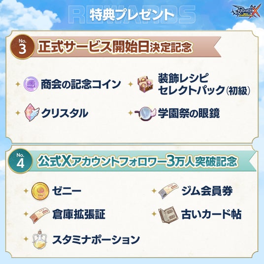 『ラグナロクX』事前登録サイトでは、「正式サービス開始日決定記念」および「公式Xアカウント フォロワー3万人突破記念」として、正式サービス開始後に受け取れる事前登録特典を新たに追加公開いたしました。