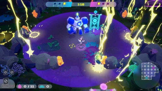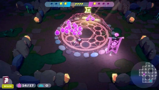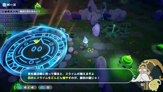 スライムを召喚して増やし、マップ上に配置された旗を4つ回収するか、相手陣の旗を回収すると勝利のシンプルルール。時には正面から、時には背後からとうまく立ち振る舞い、相手にバレないようにこっそり大旗を運んで一発逆転!