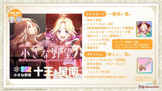獲得すると、プロデュースで使用できるほか、『【小さな野望】十王星南』の衣装/楽曲を楽しむことができるようになります。