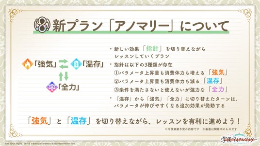 アノマリーは、「全力」「強気」「温存」の指針を活用して育成するプランです。