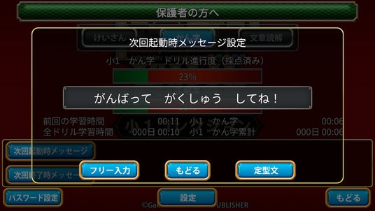 ドリル起動時と終了時に「がんばってね」「ご褒美あるよ」などコメントを送ることが可能。