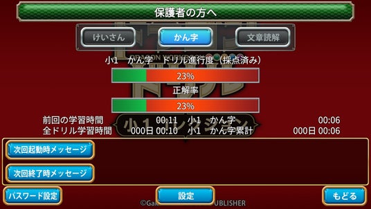 また、遊びの要素だけでなく、「ふくしゅうモード」で苦手な問題を克服できたり、保護者がドリルの内容を管理できる「保護者設定」を収録するなど、しっかり学力を身につけられる要素も充実。