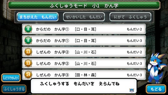 「ふくしゅうモード」では、今までに解いた問題の中から、“間違えた問題”をリスト化。