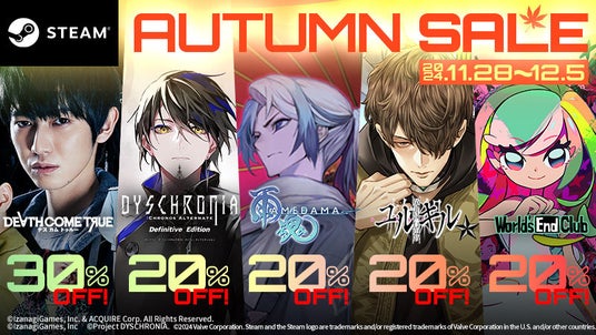 株式会社イザナギゲームズ(東京都江東区、プロデューサー兼CEO:梅田慎介)は、『Death Come True【デスカムトゥルー】』、『ワールズエンドクラブ【World's End Club】』、『冤罪執行遊戯ユルキル』、『DYSCHRONIA: Chronos Alternate【ディスクロニア クロノスオルタネイト】』、『雨魂 - AMEDAMA -』の5作品のオータムセールの実施を発表いたしました。