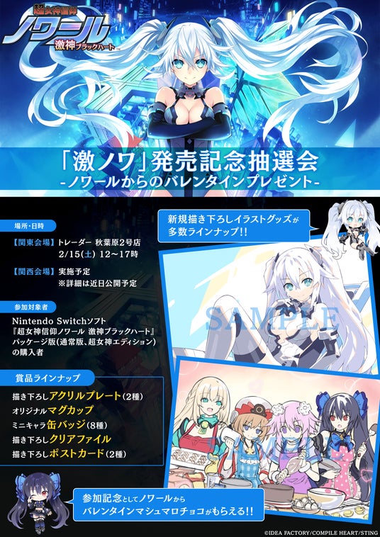 アイディアファクトリー株式会社(代表取締役社長:佐藤 嘉晃/所在地:東京都豊島区)の子会社である株式会社コンパイルハート(取締役社長:冨長 直人/所在地:東京都豊島区)は、本日12月12日(木)、『超女神信仰ノワール 激神ブラックハート』(以下「激ノワ」)の発売を記念した抽選会を実施することを発表しました。