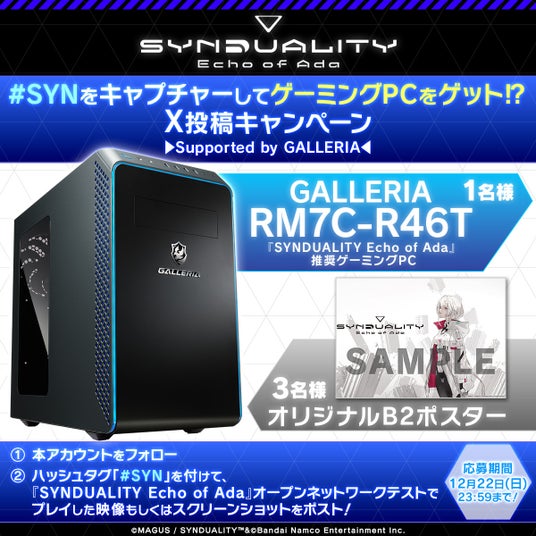 株式会社バンダイナムコエンターテインメントは、PlayStation(R)5/Xbox series X|S/STEAM(R)『SYNDUALITY Echo of Ada』に関して、オープンネットワークテスト配信開始と推奨ゲーミングPC(発売元:株式会社サードウェーブ)発売を記念し、XにてゲーミングPCが当たる投稿キャンペーンを開催することをお知らせします。開催中のオープンネットワークテストでプレイした様子を投稿すると、ゲーミングPCが1名様に、オリジナルB2ポスターが3名様に当たります。