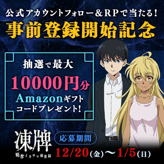 「凍牌 -略奪イカサマ麻雀録-」はリリース記念として、本日2024年12月20日(金)より2025年1月5日(月)、抽選でAmazonギフトコード 最大10,000円分が当たる公式Xにてフォロー&リポストキャンペーンを実施します。