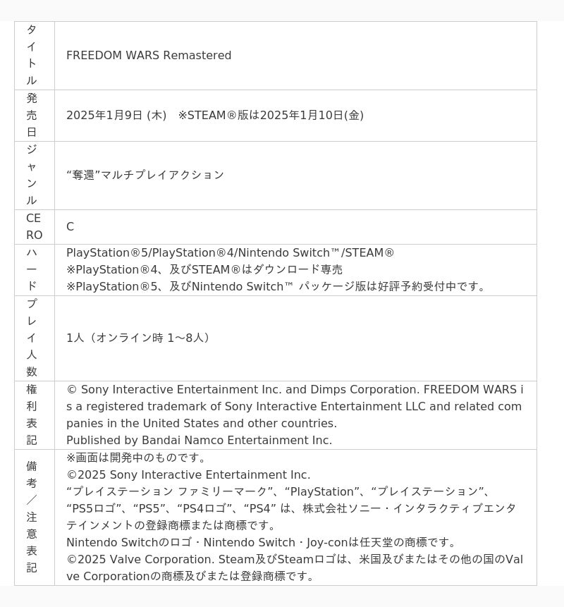 ■ 「FREEDOM WARS Remastered 公式」 Xアカウント:https://x.com/FWRe_Official