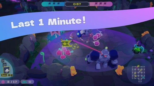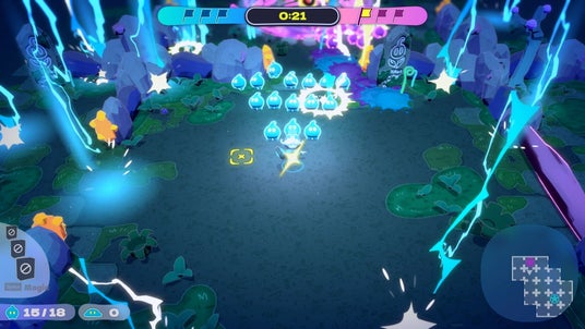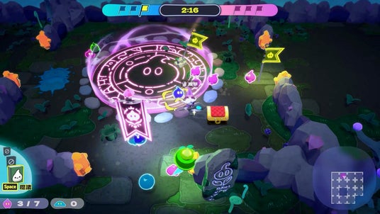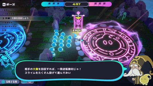 スライムを召喚して増やし、マップ上に配置された小旗を3つ回収するか、相手陣の大旗を回収すると勝利のシンプルルール。時には正面から、時には背後からとうまく立ち振る舞い、相手にバレないようにこっそり大旗を運んで一発逆転!