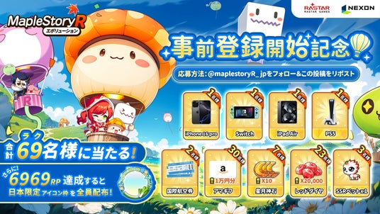 公式X(旧Twitter)アカウント(@maplestoryR_jp)にてフォロー&リポストキャンペーンを開催します。抽選でiPhone16proや10,000円分のAmazonギフト券などの賞品を合計69名様にプレゼント!さらに、6969リポスト達成すると日本限定アイコン枠を全員に配布します。