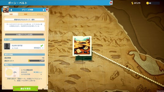 まずは、チュートリアルで解放される遠征地「ボーン・ベルト」にある調査地点で展示品を集めます。ボーン・ベルトには、恐竜の骨や化石、古代の発明品などさまざまな報酬が眠っています。