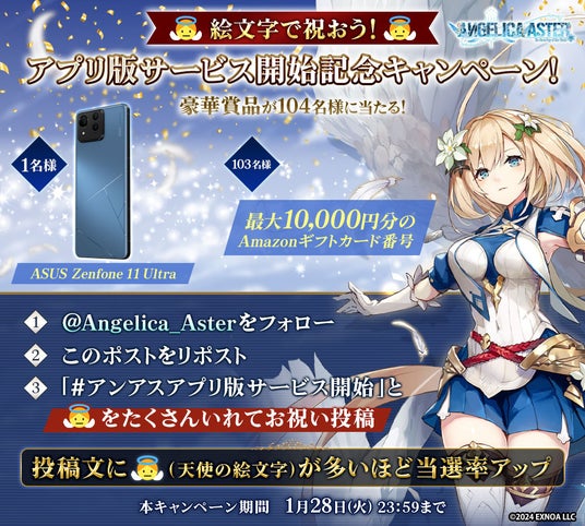 アプリ版正式サービス開始後より公式X(@Angelica_Aster)にてASUS最新モデルのスマートフォンZenfone11 Ultraなど豪華賞品が当たるプレゼントキャンペーンを実施いたします。