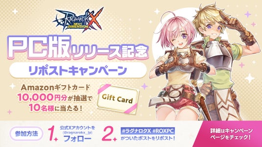 『ラグナロクX』PC版のサービス開始を記念して、Xにてリポストキャンペーンを実施いたします。『ラグナロクX』公式Xアカウントをフォローして、キャンペーンハッシュタグの入った対象のポストをリポストしてください。