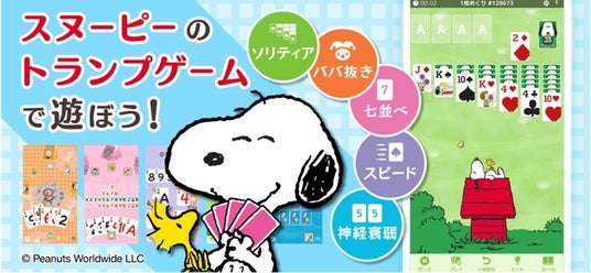 「スヌーピー ソリティア&トランプゲーム」は、ソリティア・ババ抜き・七並べ・スピード・神経衰弱の5つの人気トランプゲームが収録されており、スヌーピーと仲間たちのかわいいデザインで初心者から楽しく遊ぶことができます。