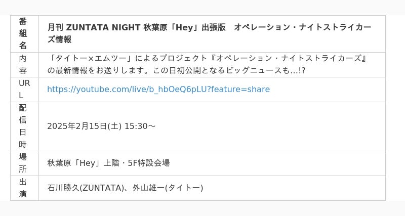 2月15日(土)配信予定のタイトーサウンドチームZUNTATAによるYouTube番組「月刊ZUNTATA NIGHT」にて、『オペレーション・ナイトストライカーズ』に関する情報を配信いたします。