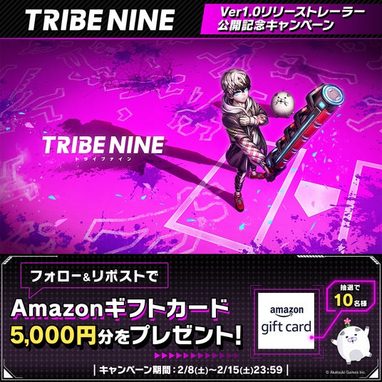 「Ver1.0リリーストレーラー」の公開を記念して、『トライブナイン』公式X(@tribenine_tokyo)にて、抽選で10名様にAmazonギフトカード5,000円分が当たるフォロー&リポストキャンペーンを開催中です。