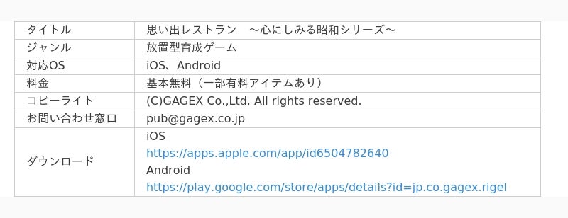 株式会社GAGEX(ガジェックス)(本社:東京都墨田区、代表取締役:井村 剣介)は、スマートフォンゲーム「思い出レストラン ~心にしみる昭和シリーズ~」を公開いたしました。