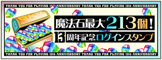 「魔法石最大213個」がもらえる13周年記念ログインスタンプをはじめ、「13周年記念!超絶スーパーゴッドフェス」の開催や、お好きなフェス限定モンスターを選んでもらえる「遊んでゲット!フェス限定プレゼント」、13周年記念クエストやスペシャルダンジョンの登場など、盛りだくさんの内容で「13周年記念イベント」を実施いたします。