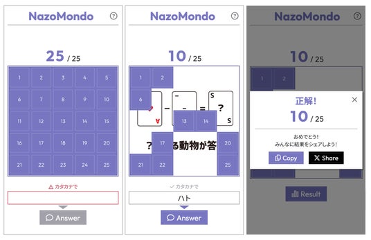 なお、株式会社batonでは、パネルを開けるとクイズの問題文が1文字ずつ表示される「指定オープンクイズ Mondo」( https://mondo.quizknock.com/ )を2022年にリリースしています。ぜひ「NazoMondo」とあわせてお楽しみください。