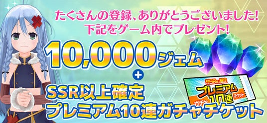 事前登録者数5万人の突破を記念して最大報酬の10,000ジェムとSSR以上確定プレミアム10連ガチャチケット×1の配布が確定しました。たくさんの応援ありがとうございます。