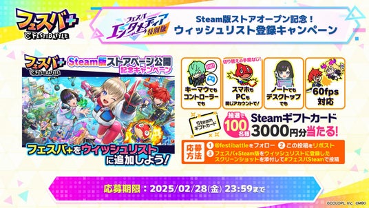 株式会社コロプラ(代表取締役社長 上席執行役員 CEO:宮本貴志、本社:東京都港区、以下「コロプラ」)は、株式会社MIXI(代表取締役社長 上級執行役員 CEO:木村弘毅、本社:東京都渋谷区、以下「MIXI」)と共に取り組んでいるスマートフォン向けゲーム『フェスバ+』において、Steam版のサービス開始日が2025年3月14日(金)に決定したことをお知らせいたします。