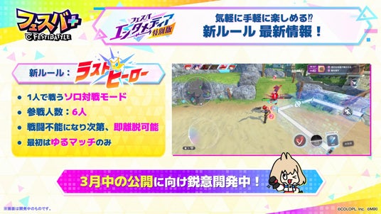 さらに、ヒーローの調整をはじめ、今後追加される新ルール「ラストヒーロー」や他タイトルとのコラボの構想など、今後の『フェスバ+』についての情報も公開いたしました。これらの情報は本日2025年2月21日(金)に公式YouTubeチャンネルの「フェスバ+公式」にて放送した情報番組「エンタメディア特別版」内で、最新情報をお届けしておりますので、ぜひご覧ください。