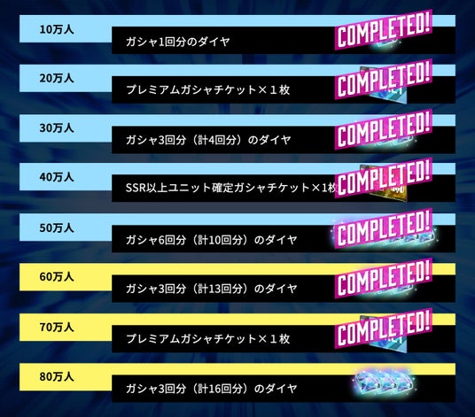 600,000人突破⇒ガシャ3回分(計13回分)のダイヤ 達成済