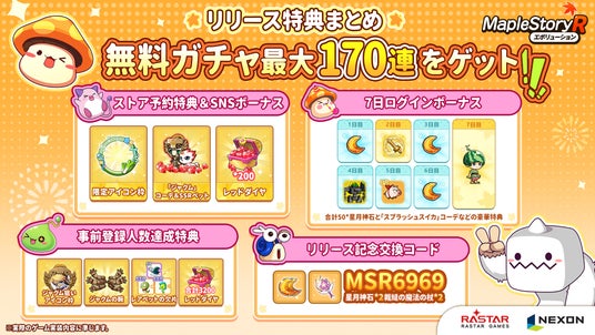 『メイプルストーリーR』の正式リリースに伴い、最大6969万レッドダイヤの山分けキャンペーン開催決定。アマギフ5000円分やメイプルRグッズ、限定武器外観、星月神石などの特典を獲得するチャンスをお見逃しなく!