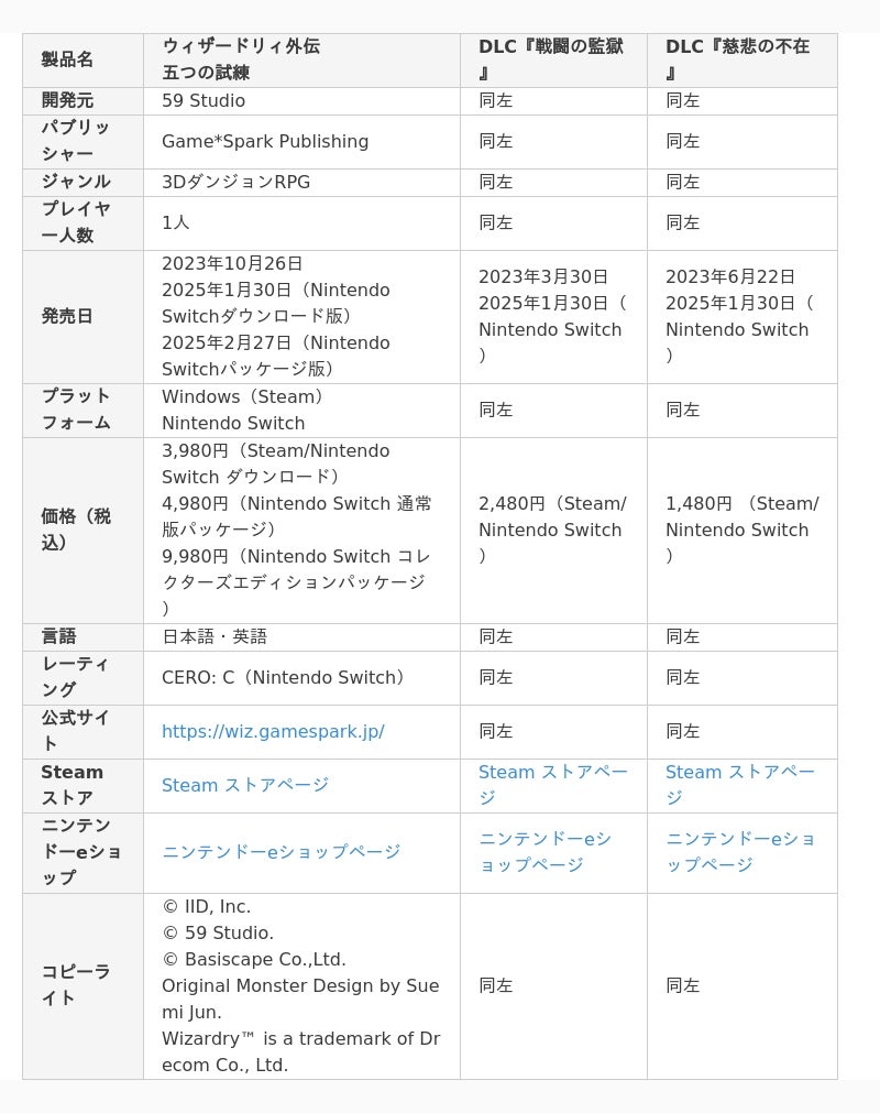 株式会社イード(本社:東京都中野区、代表取締役:宮川 洋、以下 イード)は、当社の運営するゲームメディア「Game*Spark」のブランド「Game*Spark Publishing」において、 Nintendo Switchダウンロード版が好評販売中の3DダンジョンRPG『ウィザードリィ外伝 五つの試練』Nintendo Switchパッケージ通常版・コレクターズエディションを全国各小売店舗にて2025年2月27日(木)に発売いたしました。