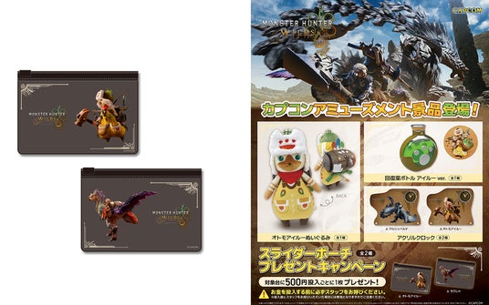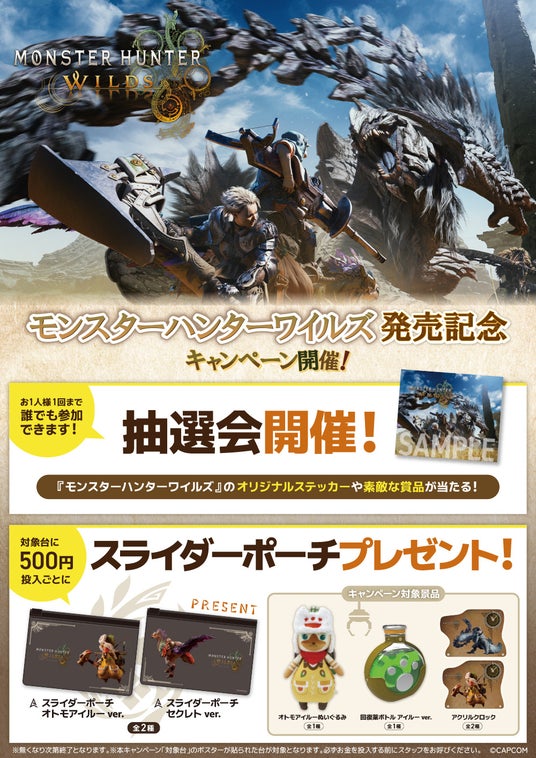 『モンスターハンターワイルズ』の発売を記念して、カプコンのアミューズメント店舗にオリジナルプライズ景品も登場! こちらのプライズ景品が投入された対象機をプレイするとノベルティの「スライダーポーチ(全2種)」がもらえるマストバイキャンペーンも展開いたします。
