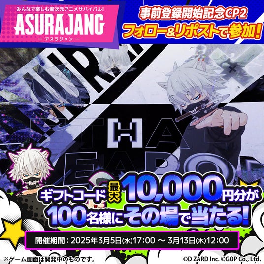『ASURAJANG』の事前登録開始を記念して、100名様に最大1万円分のAmazonギフトカードがその場で当たるフォロー&リポストキャンペーンを開催しております。
