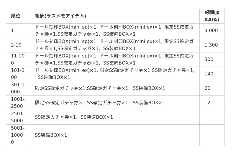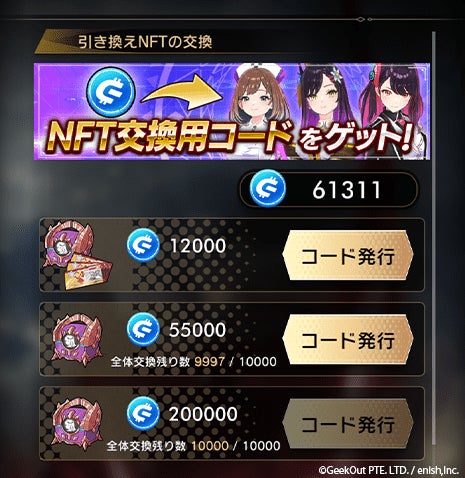 ランキング報酬とは別に、プレイ中にドロップしたminiGEEKを貯めれば、ラスメモで使用できるNFTドールと交換できます。一番簡単に交換できるNFT交換では、ラスメモの100連ガチャ券もついてきますので、是非この機会にプレイしてください。