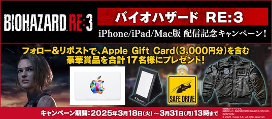 iPhone/iPad/Mac版『バイオハザード RE:3』の発売を記念して、抽選でApple Gift Card(3,000円分)や「バイオハザード」オリジナルグッズが当たるキャンペーンを開催いたします。