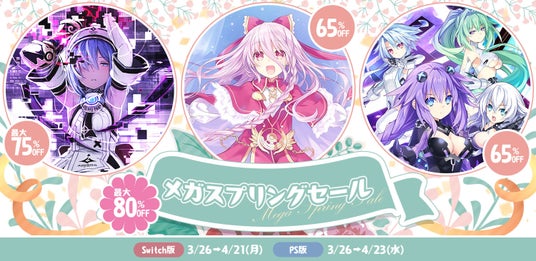 アイディアファクトリー株式会社(代表取締役社長:佐藤 嘉晃/所在地:東京都豊島区)の子会社である株式会社コンパイルハート(取締役社長:冨長 直人/所在地:東京都豊島区)は、本日3月26日(水)よりニンテンドーeショップおよびPlayStation(R)Storeにて《メガスプリングセール》を開始いたしました。