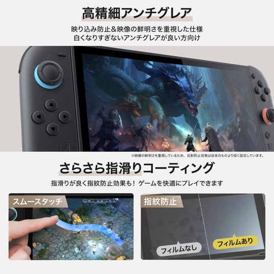 モンスターフィルム Switch2用 反射防止アンチグレアタイプ特徴: 反射防止機能により、屋外や明るい場所でも画面が見やすくなり、ゲームのストレスなく楽しめます。指紋や汚れが目立ちにくく、清潔に保てます。