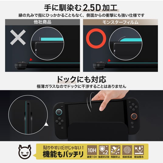 モンスターフィルム Switch2用 ブルーライトカット タイプ特徴: 約97.2%のブルーライトカット機能により、長時間のゲームプレイをサポートし、快適さを維持します。強化ガラス製で、タッチ操作にも対応しており、デバイスをしっかり守ります。