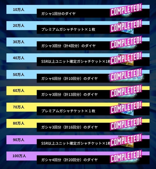 1,000,000人突破⇒ガシャ4回分(計20回分)のダイヤ 達成済