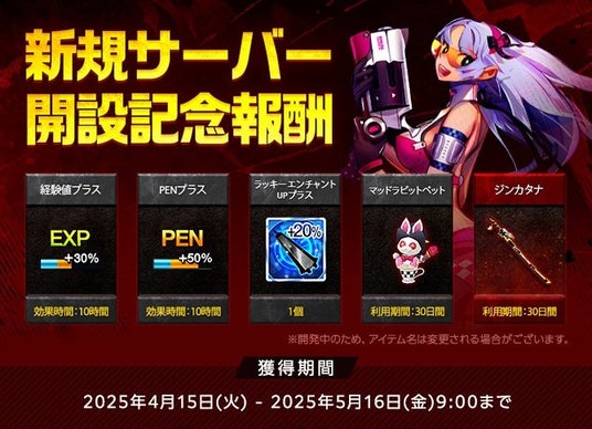 オープンβテストおよび新規サーバー開設を記念し、期間中にキャラクターを作成いただいたすべてのプレイヤーに、ゲームプレイに役立つ各種アイテムをプレゼントいたします。・イベント期間:2025年4月15日(火) ~ 5月16日(金)9:00
