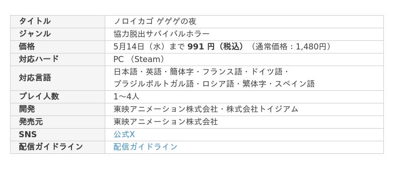 東映アニメーション株式会社(本社:東京都中野区、代表取締役社長:高木勝裕)と株式会社トイジアム(本社:東京都千代田区、代表取締役会長:森好文)は、「ゲゲゲの鬼太郎」を原作とした新作ホラーゲーム『ノロイカゴ ゲゲゲの夜』の大型アップデートを5月1日(木)に実施し、今回のアップデートを経て早期アクセスから正式リリースへ移行したことをお知らせいたします。今回のアップデートの目玉は新妖怪【雪女】 & 新ステージ【鉱山】、DLCの追加になります。